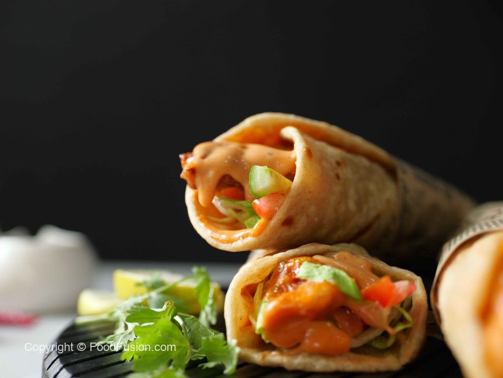 -Paratha per dynamite sauce dal ker pheela lein,iceberg,tamatar,kheera aur dynamite chicken dal kar fold karein aur butter paper mein wrap ker lein (makes 6-8 Paratha rolls).