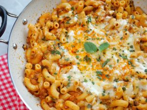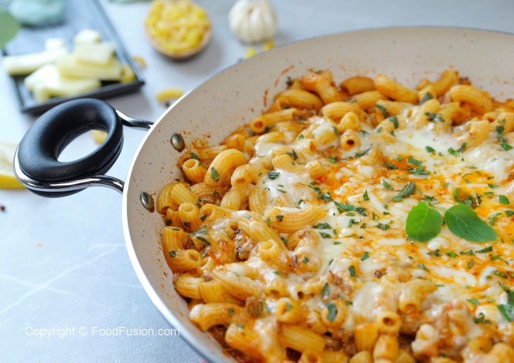 -Add boiled pasta,prepared tomato sauce,mozzarella cheese,cheddar cheese & mix well.