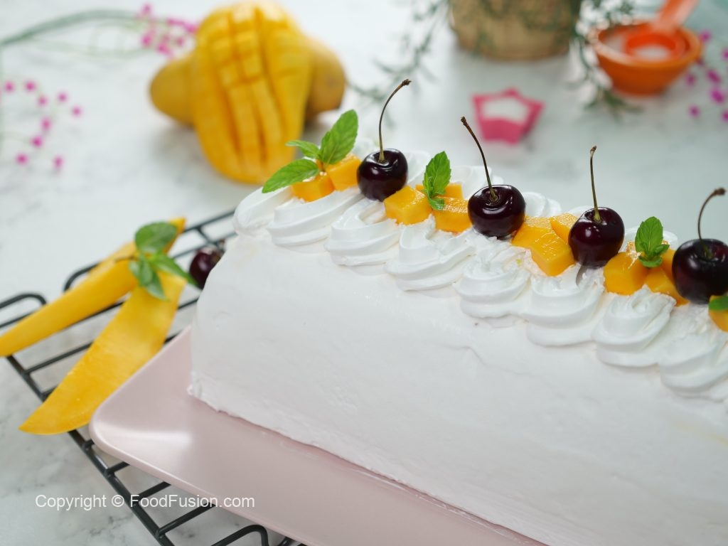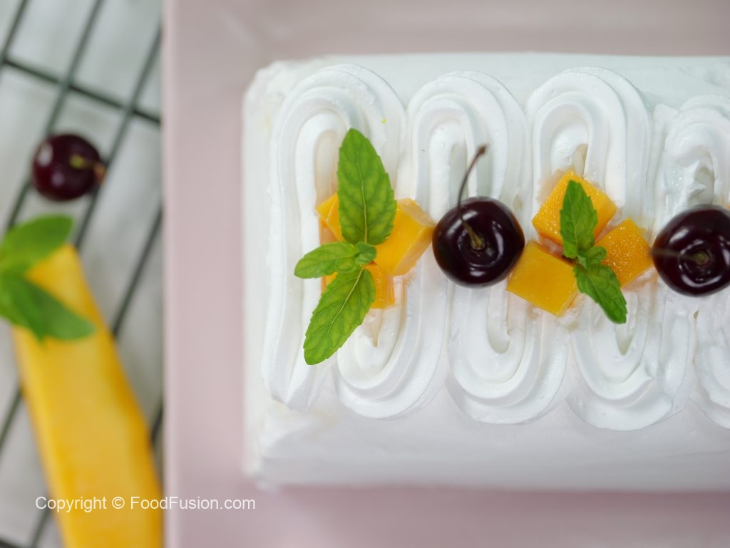 -Decorate with whipped cream,mango chunks,cherries & mint leaves.