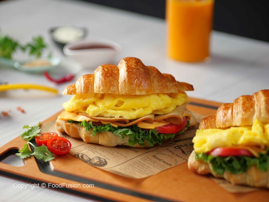 -Toasted croissant par tayyar sauce,salad patta,tamatar slices,cheddar cheese slices,mortadella slices aur scrambled egg rakh kar doosra croissant upar se rakh dein (makes 2).