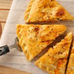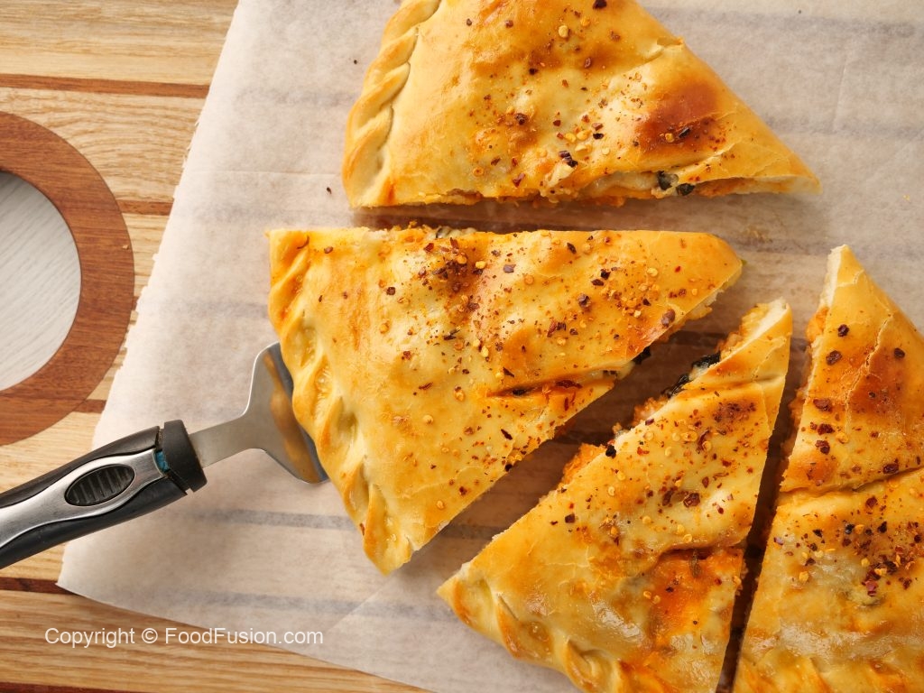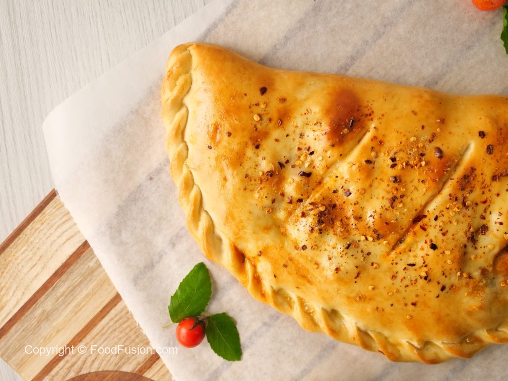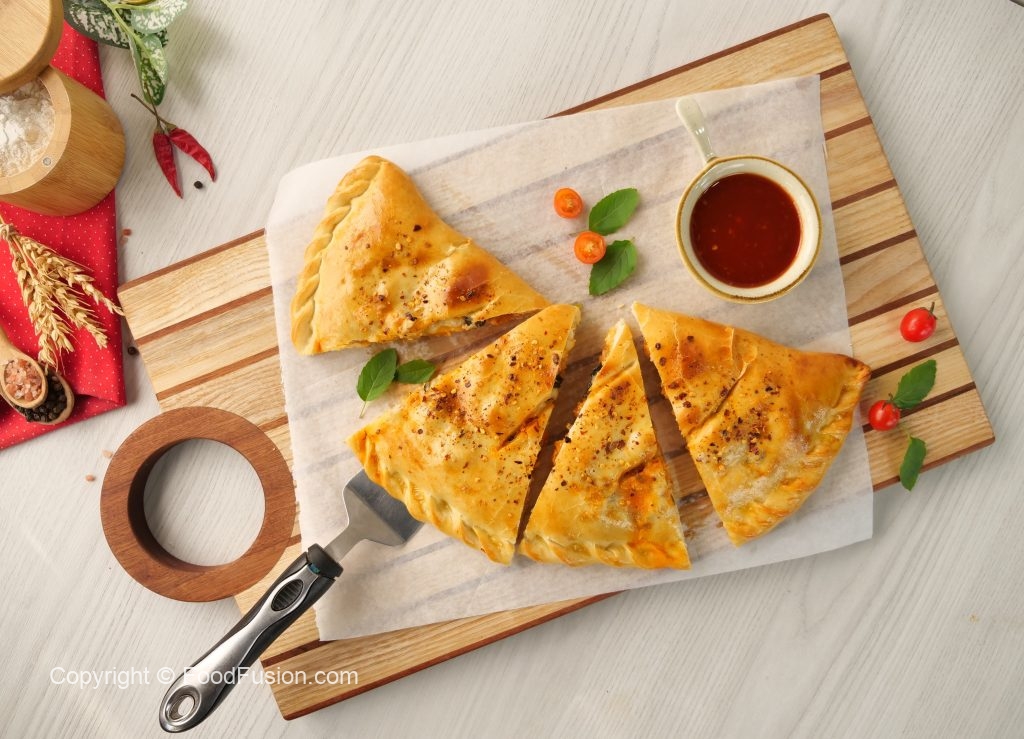 -On baking tray,place prepared calzone & with the help of the knife slightly add marks on the surface,apply egg wash & sprinkle red chilli crushed (makes 2).