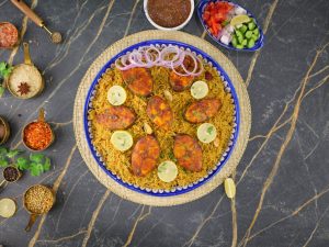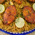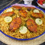 -In a serving platter, add mandi rice, baked fish, garnish with lemon slices, give a coal smoke & serve with prepared mandi sauce & salad!