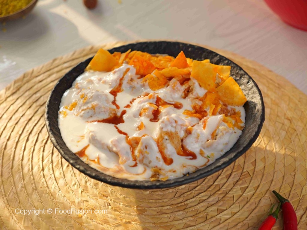 -In a bowl, add prepared dahi bhallay break them with spoon, sprinkle Dahi bada masala, papri, pour creamy meethi dahi, prepared imli chutney & serve!