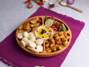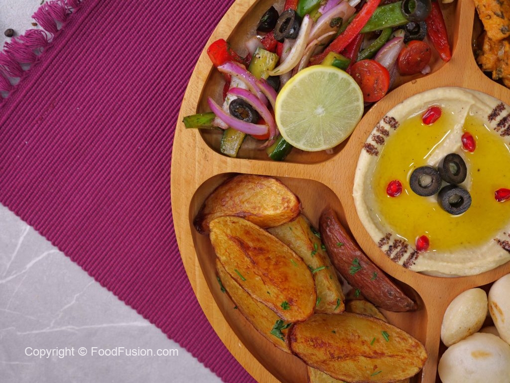 -Serve lemon herb chicken with hummus, prepared balsamic tomato cucumber salad, potato wedges & pita bites!
