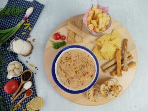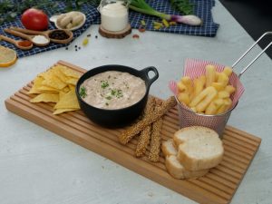 Garnish with chicken sausages,paprika powder & can be used or served with garlic bread,French fries,crackers and nachos.