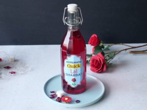 -In a serving glass,add ice cubes,milk,lal sharbat & stir.
