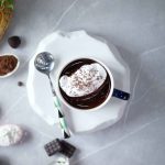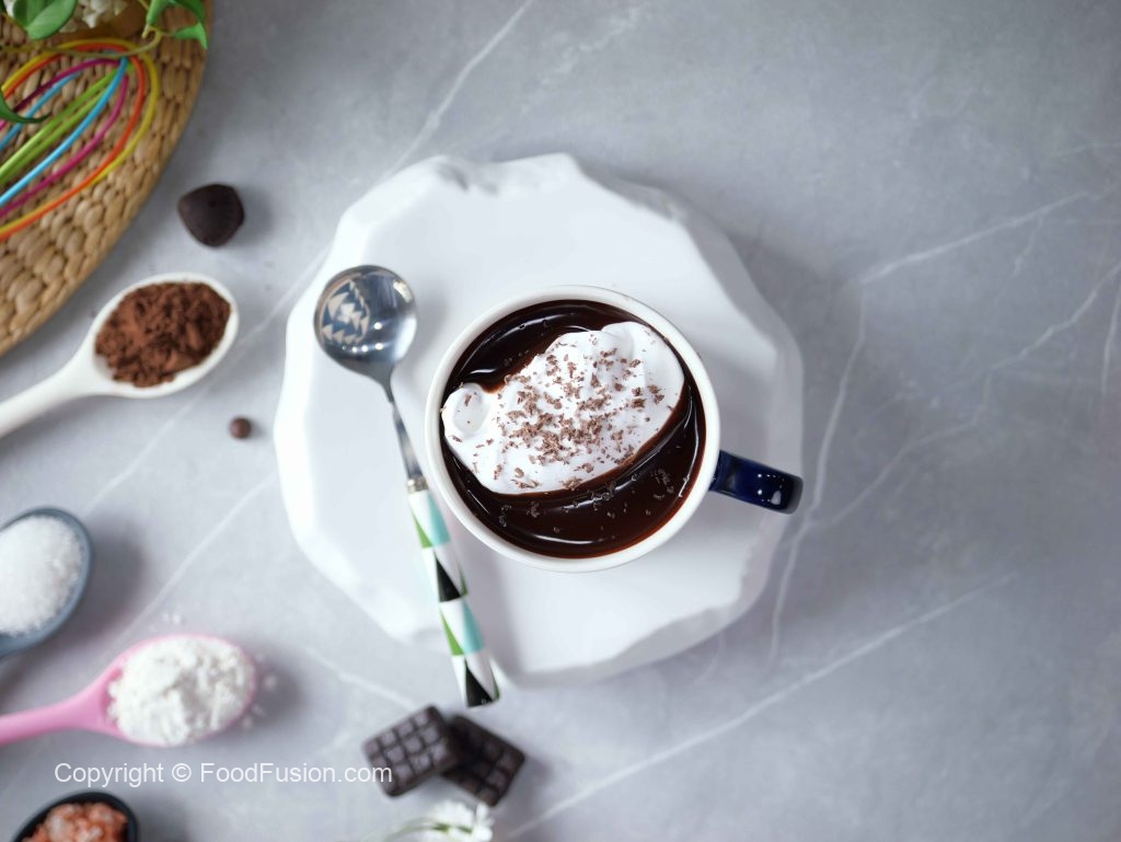 -Take out from oven,pour prepared hot chocolate,add whipped cream & garnish with grated dark chocolate & serve!