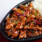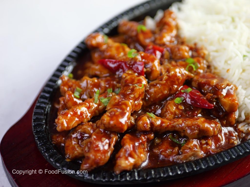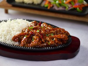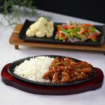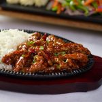 -Grease hot sizzling plate with butter,add rice,hot garlic chicken & serve with mash potatoes & sauteed vegetables!