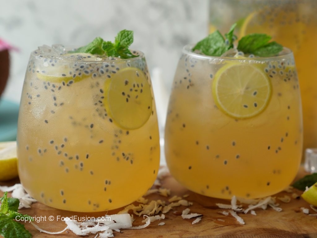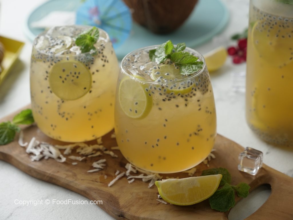 In a serving glass,add crushed ice,lemon slices,soaked basil seeds,prepared coconut nut iced tea & serve!