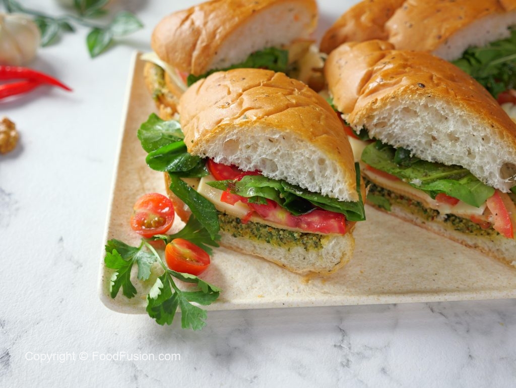 -Tayyar pesto,mortadella slices,cheese slices,tamatar,rocket leaves,olive oil,pink salt aur kali mirch powder dal dein aur top bread se cover karein.