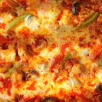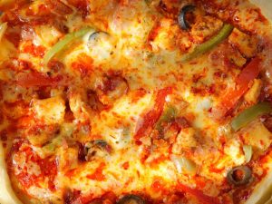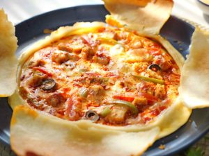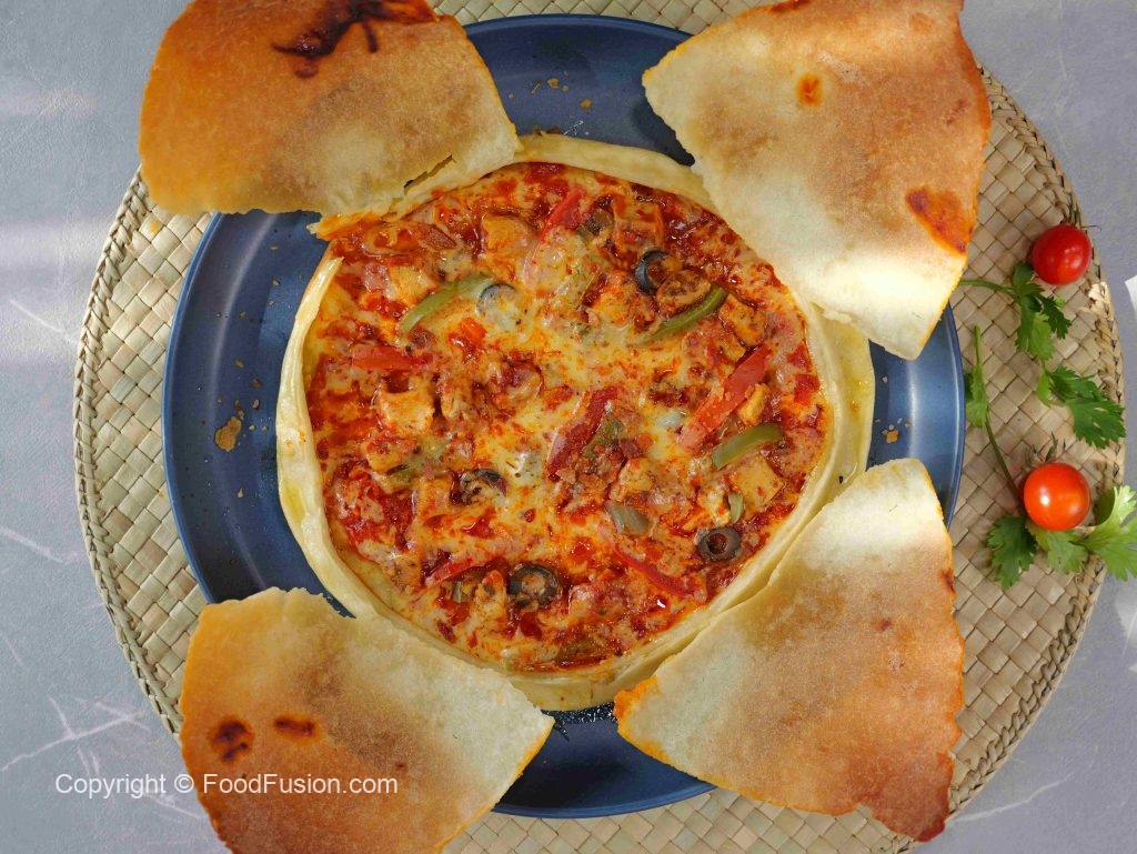 -Rolled dough ko baking paper par rakhain, cheddar aur mozzarella cheese, pizza sauce, cooked chicken, shimla mirch, tamatar, corn, olives, jalapenos, oregano aur crushed lal mirch dalein.