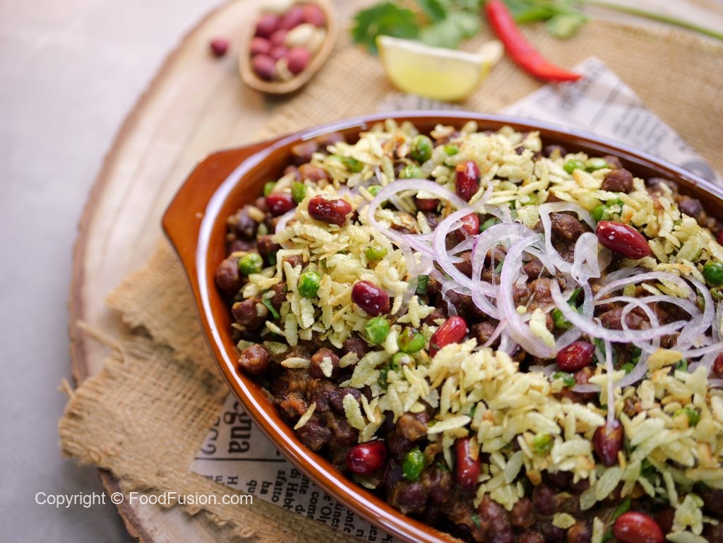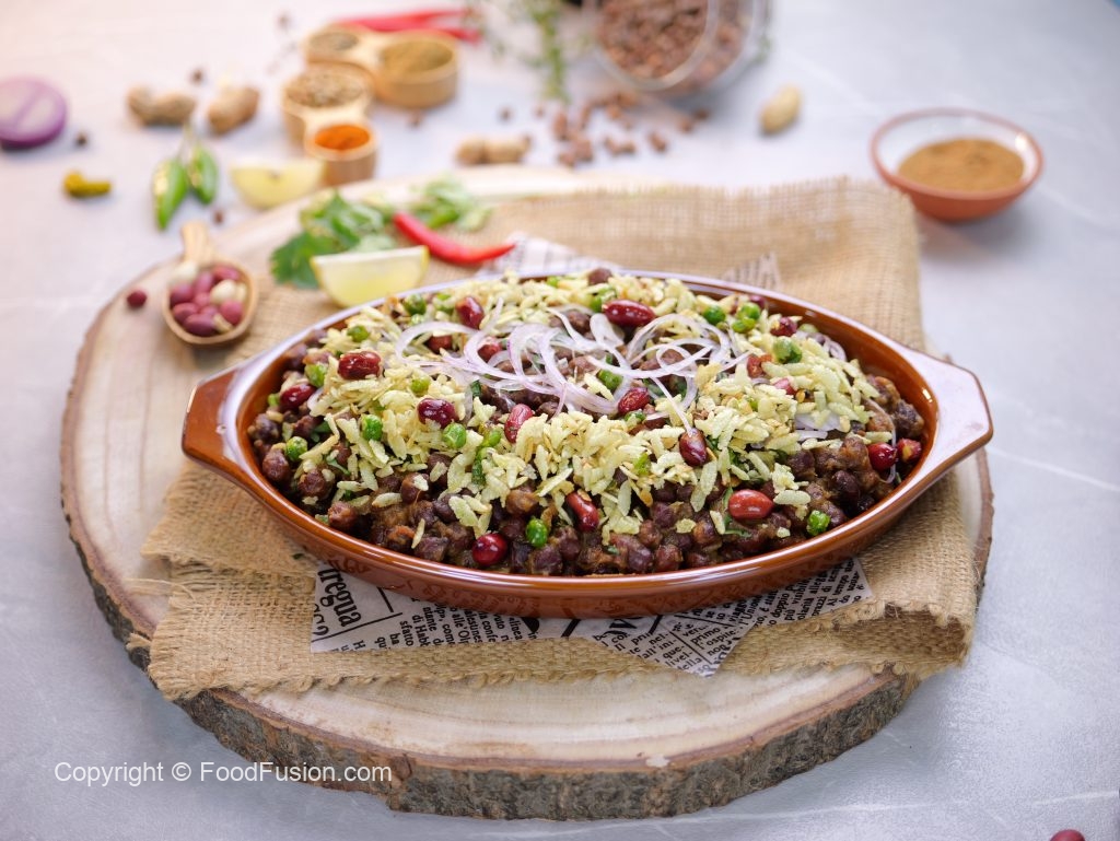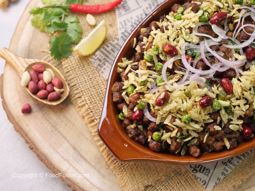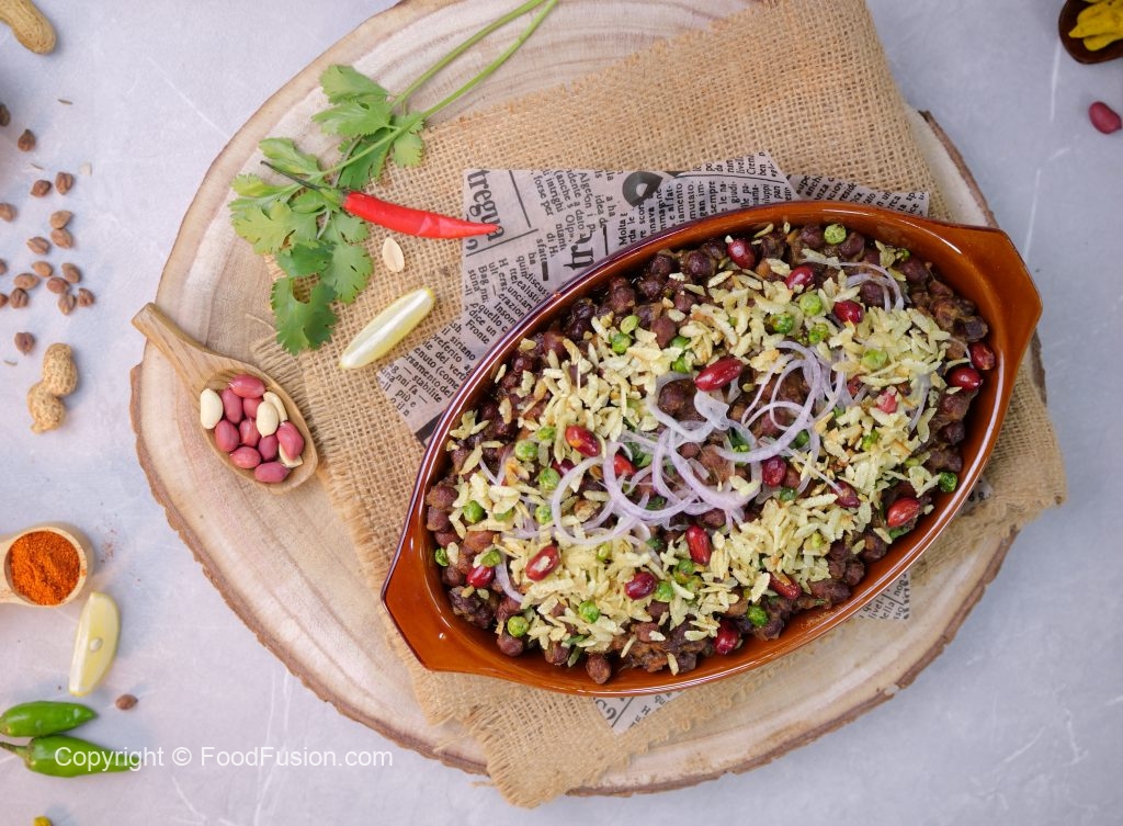 -Serving dish mein cooked kalay chanay,chaat masala,hara dhania,pyaz aur tayyar matar chewra dal ker serve karein!
