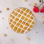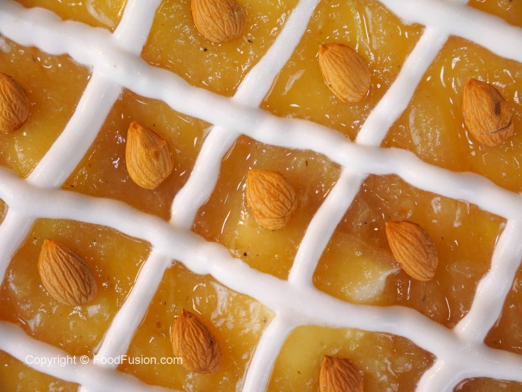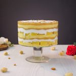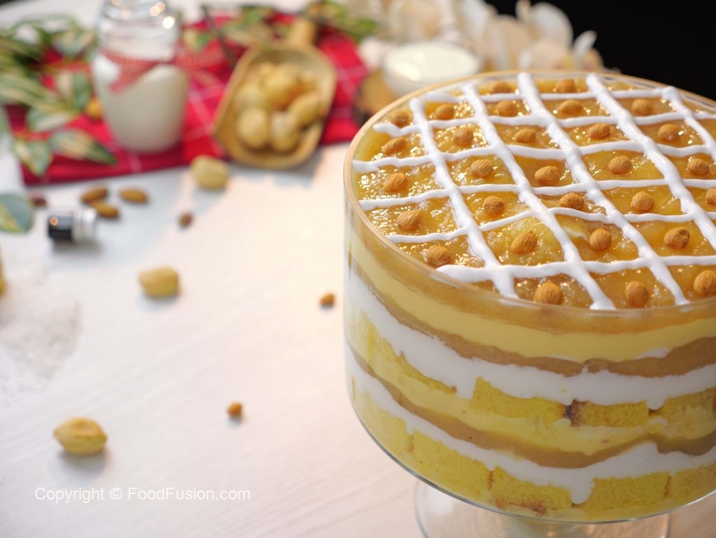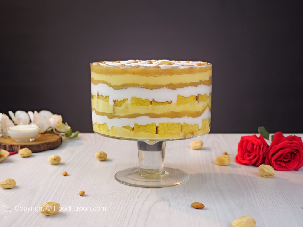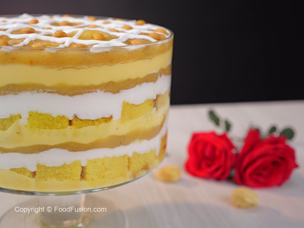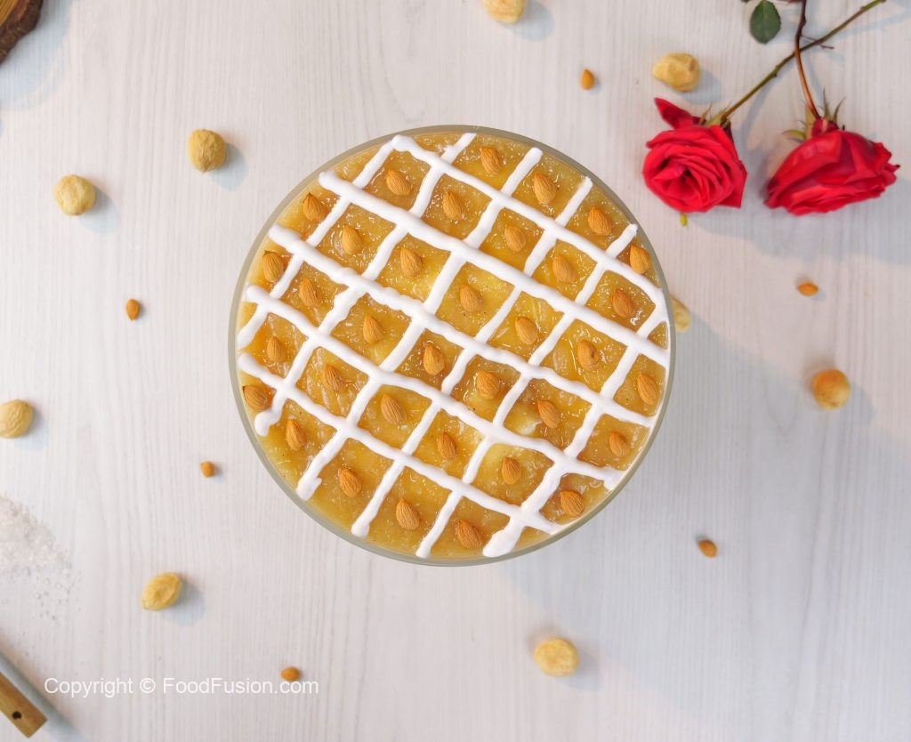 -In a serving dish, add a layer of prepared custard, cake sponge, sugar syrup, whipped cream, pistachios, almonds, prepared apricot compote, repeat layers again.