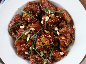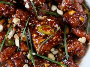 -In a wok,add garlic,ginger,tomato ketchup,soy sauce,vinegar,water,cornsyrup,brown sugar,red chilli powder,salt & red chilli crushed.