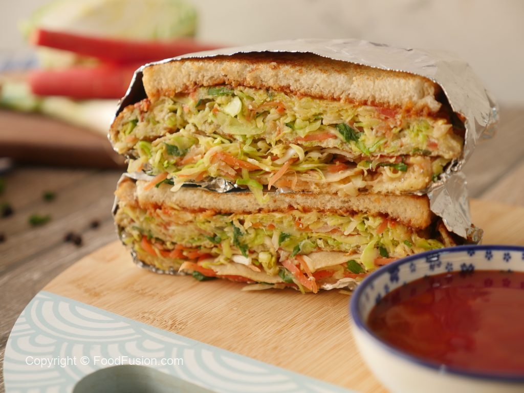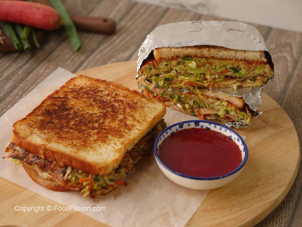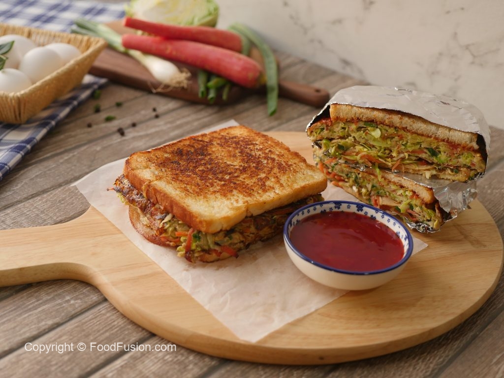 Vegetable & egg omelet per reserved vegetables,chicken salami dal ker toasted bread slice rakh dein phir flip ker ka bareek cheeni aur tomato ketchup dal dein aur top per remaining bread slice rakh dein.
