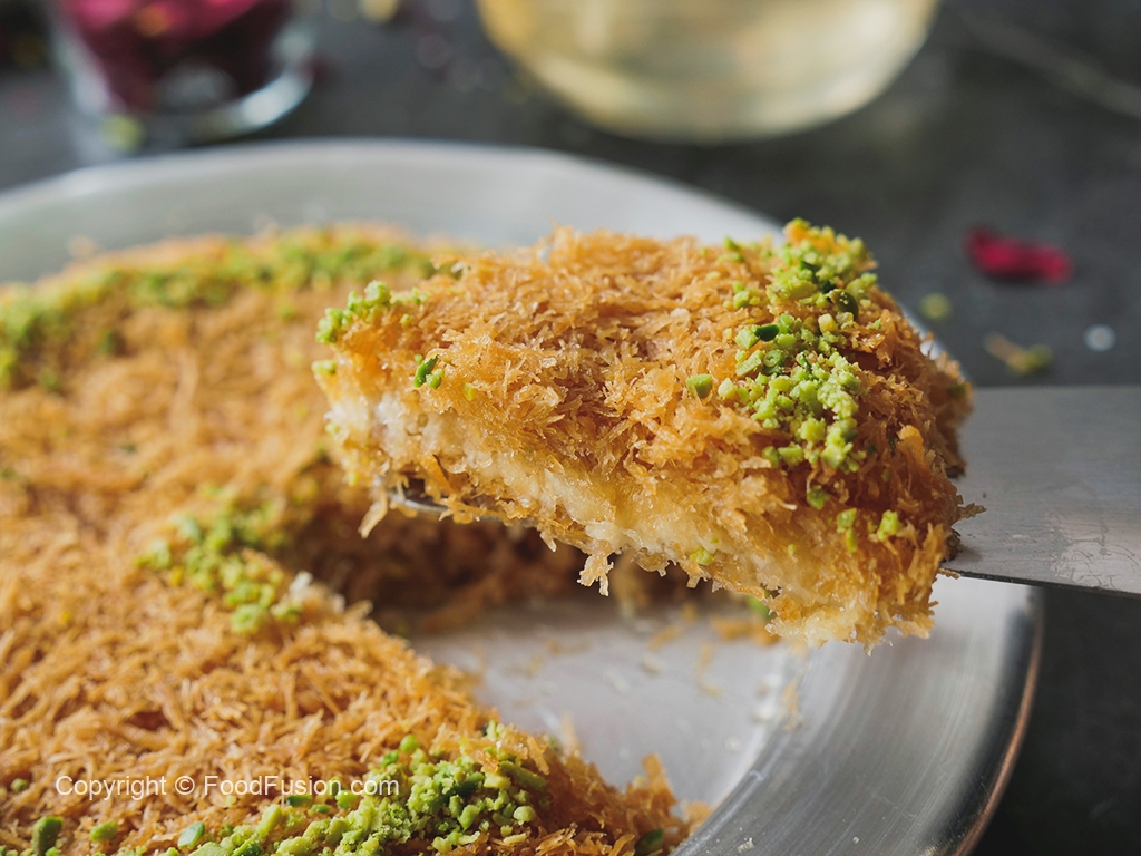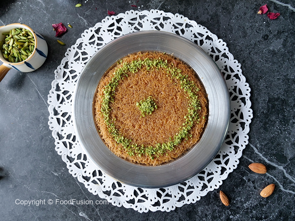 Tayyar kunafa rakh ker dhak dein aur darmiyani ancch per 18-20 minutes kliya pot mein bake ker lein.
