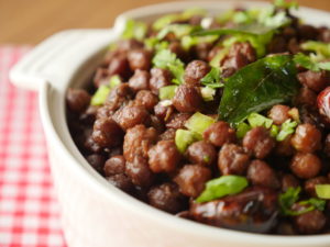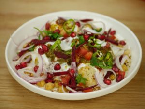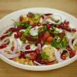 Add chickpeas then add Onion, tomatoes, Green chilies, Cumin powder, red chili powder, chaat masala and both chutneys.