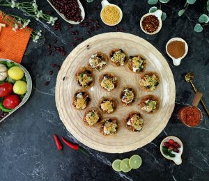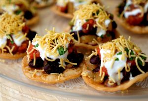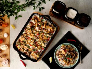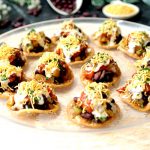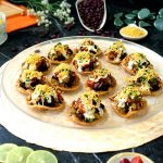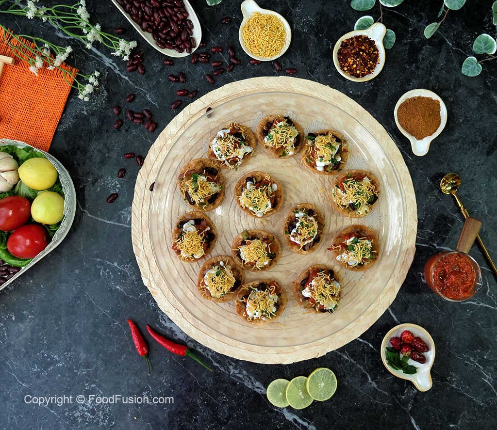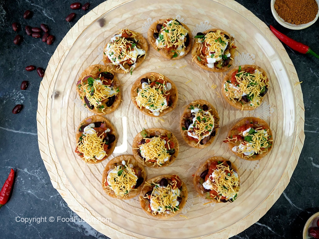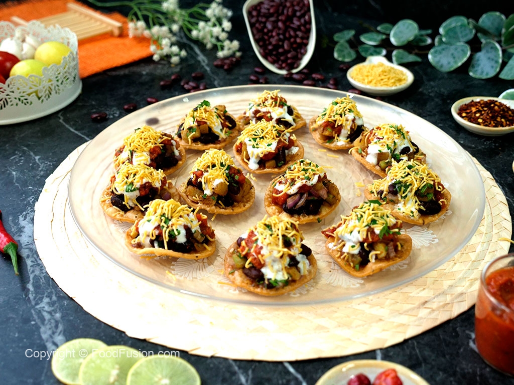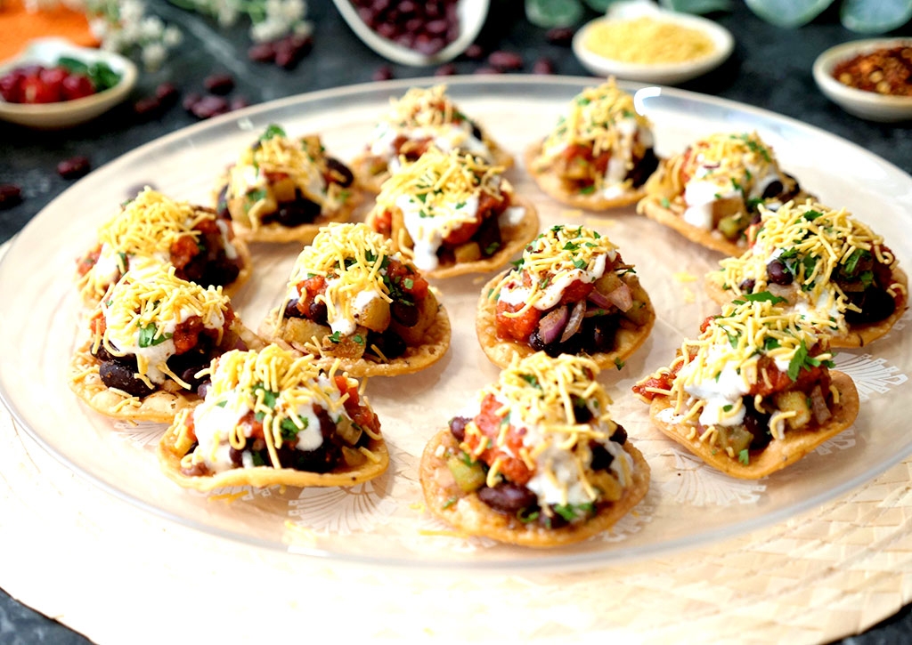 On papri,add lobia chaat,prepared tangy tamatar chutney,yogurt,sprinkle chaat masala,red chilli crushed,fresh coriander,sev,lemon juice & serve!