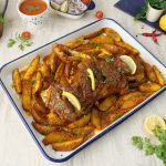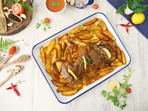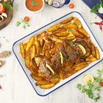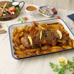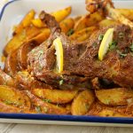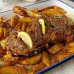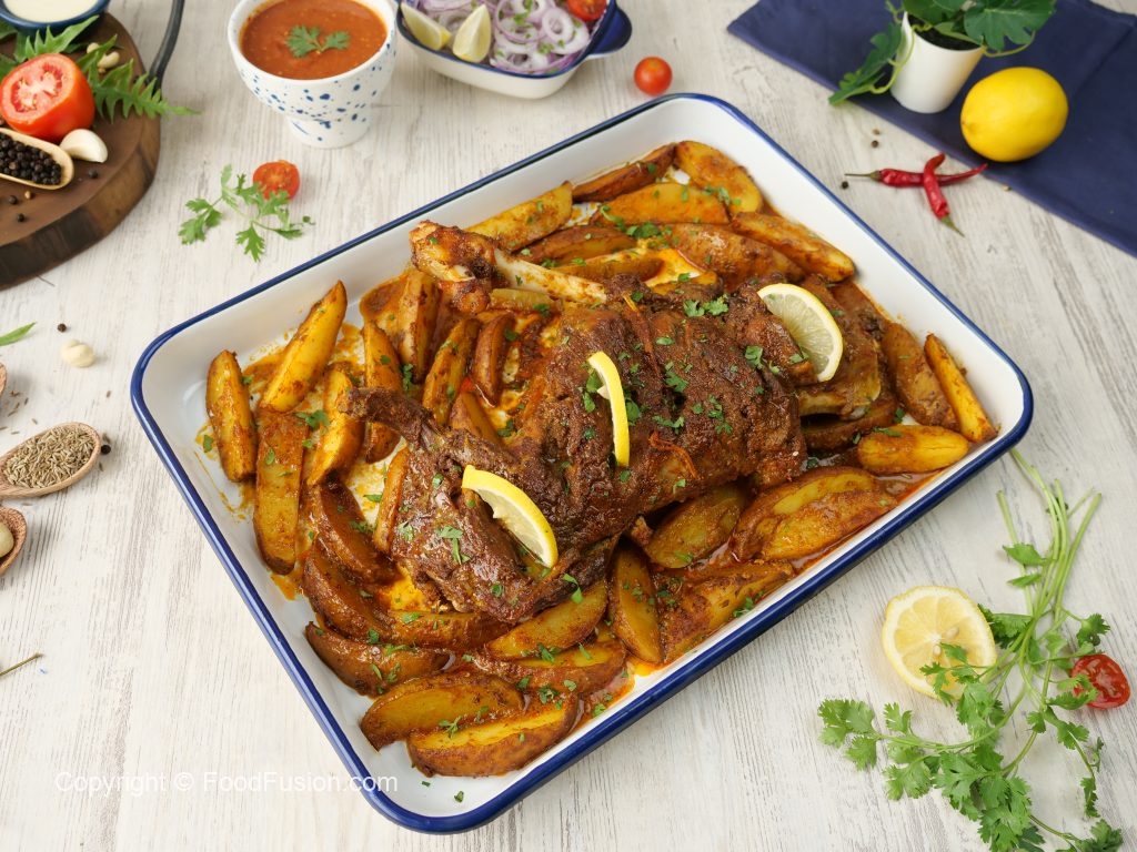 Take out baking tray from oven,remove aluminum foil,apply marinade from baking tray on mutton leg where required & potatoes with the help of brush.