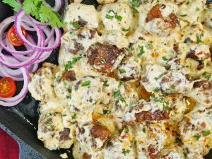 -Tayyar creamy yogurt sauce drizzle karein,hara dhania chirak dein,rice,naan ya sautéed vegetables ka saath serve larein!