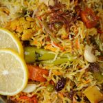 -Hara dhania,podina,elaichi powder,fried kishmish & kaju,reserved fried pyaz,kewra essence,hari mirchein,zarda ka rang aur desi ghee dal dein,kitchen towel & lid sa cover karein aur halki ancch per 12-15 minutes kliya steam cook ker lein.