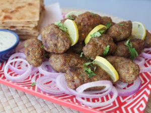 -In a chopper,add chicken,onion,green chillies,fresh coriander,gram flour,Kashmiri red chilli powder, coriander seeds,salt,cumin seeds,red chilli crushed & lemon juice,chop until well combined & refrigerate for 30 minutes.