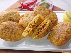 -Grease hands with oil,take small quantity of mixture & make kababs by pressing in fist (makes 23-25).