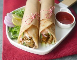 On paratha,drizzle prepared sauce,cabbage,cucumber,onion,lemon juice,cooked mutton and wrap with butter paper & serve!