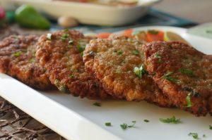 Ab breadcrumbs mein coat karein aur press ker ka haathon ki madad sa flat ker lein (makes 12-13).