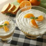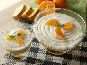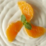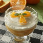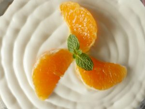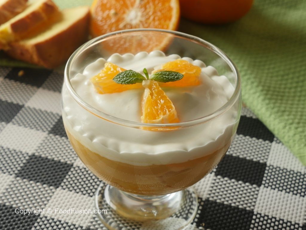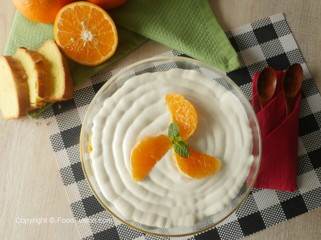Serving dish mein whipped cream dal dein aur orange slices sa decorate ker lein.