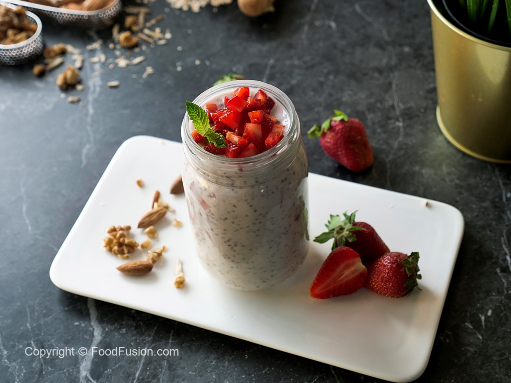 Mason jar mein instant oats,chia seeds,dahi,shahad,strawberries aur doodh dal ker ache tarhan mix karein aur dhak ker 6 hours ya overnight kliya refrigerator mein rakh dein.