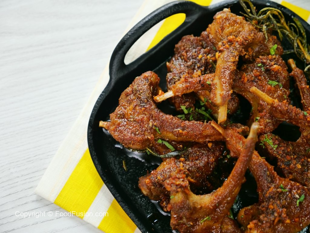 -Add spice coated mutton chops & fry on low flame from both sides until golden brown.