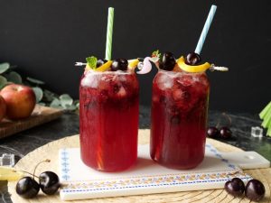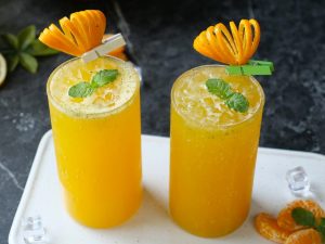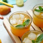 -Serving glass mein ice cubes,peach slices,tayyar peach drink aur podina dal kar serve karein!