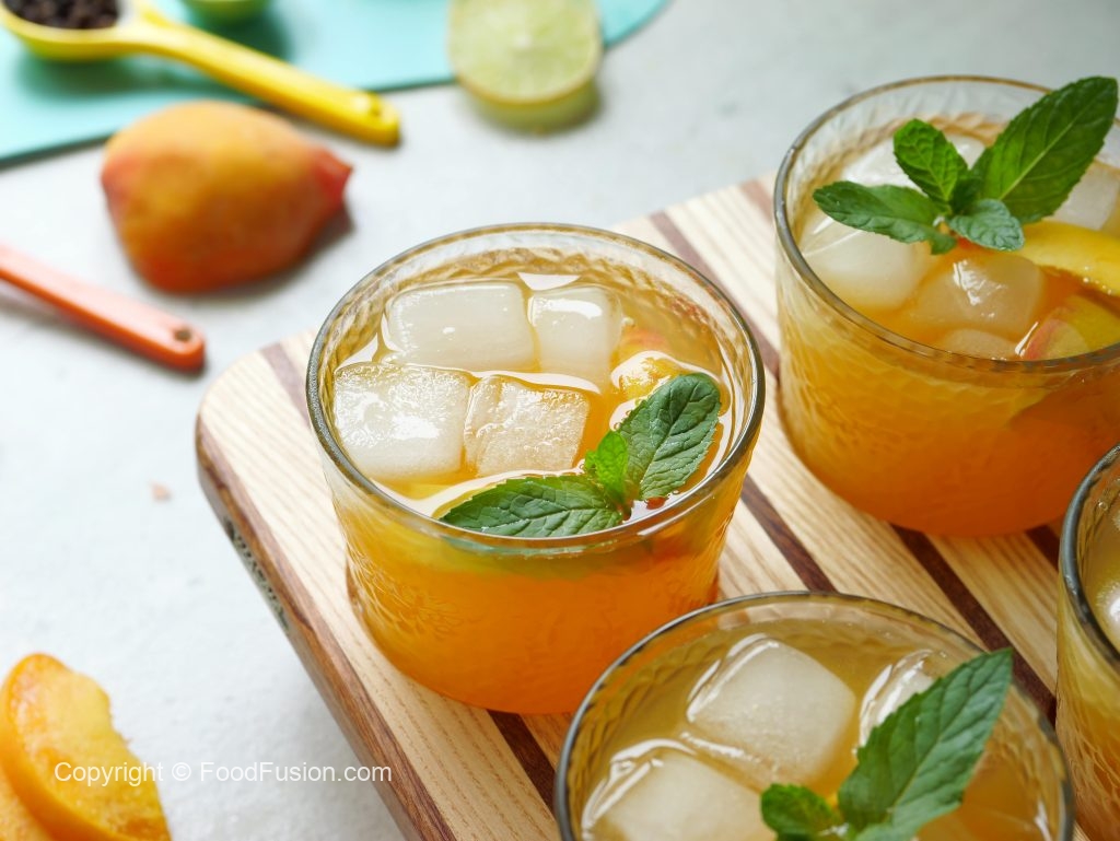 -In a serving glass,add ice cubes,peach slices,prepared peach drink,mint leaves & serve!