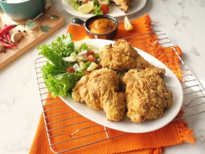 Crispy air fried chicken ko sauce & salad ka sath serve karen.