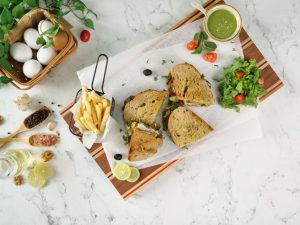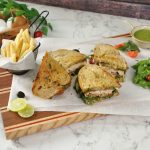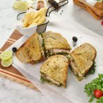 -On bread slice,add & spread prepared pesto sauce,add baby spinach,tomato slices,cheddar & mozzarella cheese,chicken fillet,cheddar & mozzarella cheese,pesto sauce & cover with another bread slice & grill for a minute until cheese melts (makes 3).