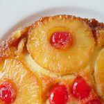 In 8 x 8 inch baking pan,add cooked sugar syrup,place pineapple rings,cherries and pour prepared batter.