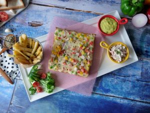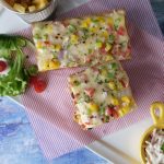 In a bowl,add capsicum,tomato,onion,colored bell pepper,salt,black pepper powder,dried oregano, mozzarella cheese,cheddar cheese,mix well & set aside.