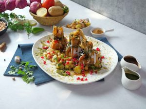 -In a serving platter,add prepared tamarind chutney,green chutney,yogurt,chana mix,potli samosa,pour yogurt,tamarind chutney, green chutney,pomegranate & serve!