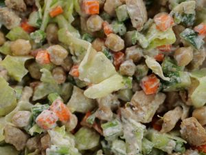 -In a mason jar,add prepared ranch dressing,cucumber,chickpeas,carrot,celery,cooked chicken, iceberg & cover with lid.