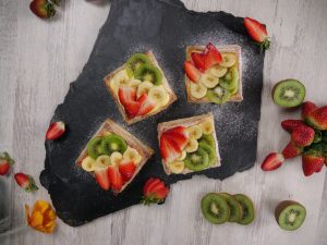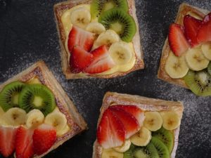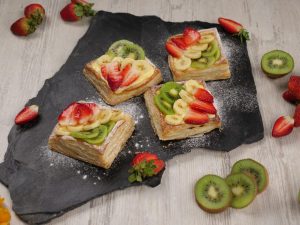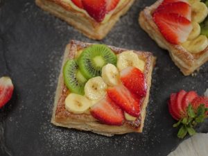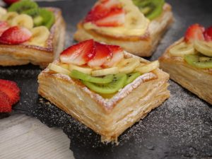 -On a clean working surface,dust dry flour,place puff pastry,sprinkle dry flour & roll out with the help of rolling pin in rectangular or square shape then cut the puff pastry into ½ inch strips & set aside.