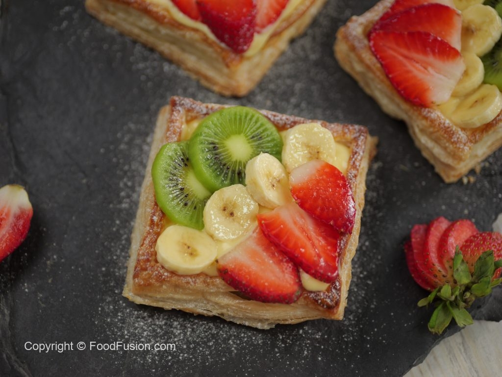 -Clean working surface per maida chirak ker puff pastry rakh dein,maida chirak ker rolling pin ki madad sa rectangular or square shape mein bail lein phir ½ inch strips mein cut ker lein & side per rakh dein.