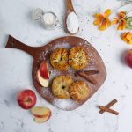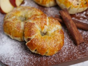 -Wrap each apple rings with puff pastry strips,poke the end of one strips in the hole,hold it with finger & wrap it around the apple ring & under (makes 4).