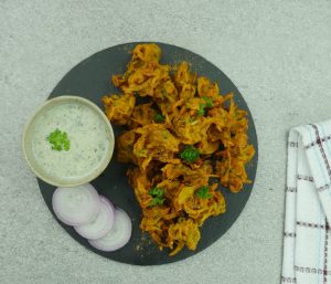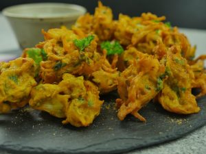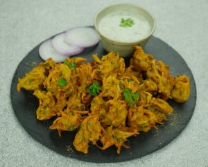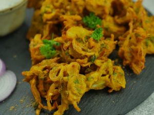 In wok,heat cooking oil and fry onion pakora on low flame until golden brown.