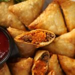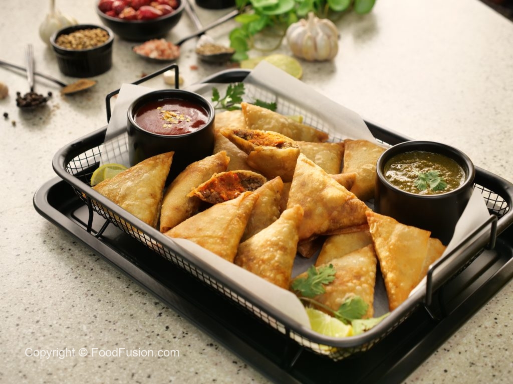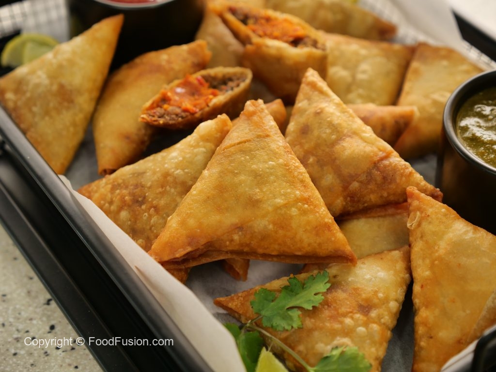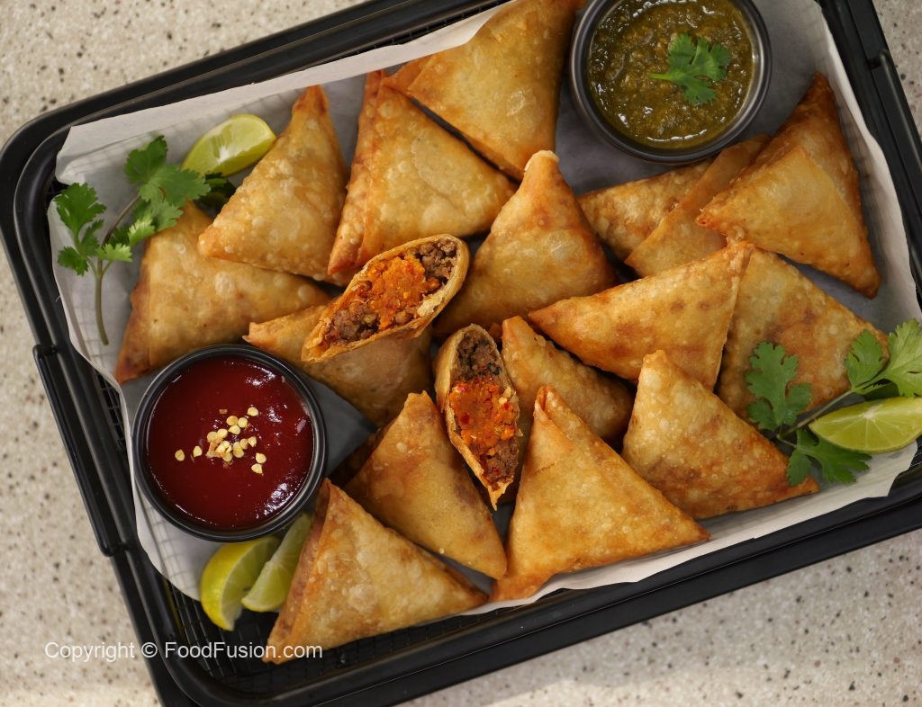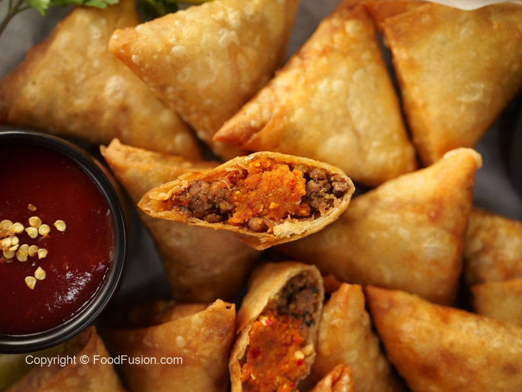 -Take samosa sheet & make pocket,add prepared mince filling,prepared red chutney,mince filling,roll into the shape of samosa & seal corners with flour slurry (makes 15).