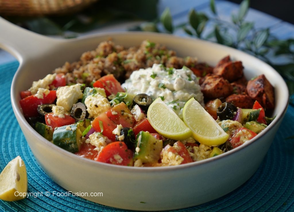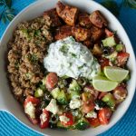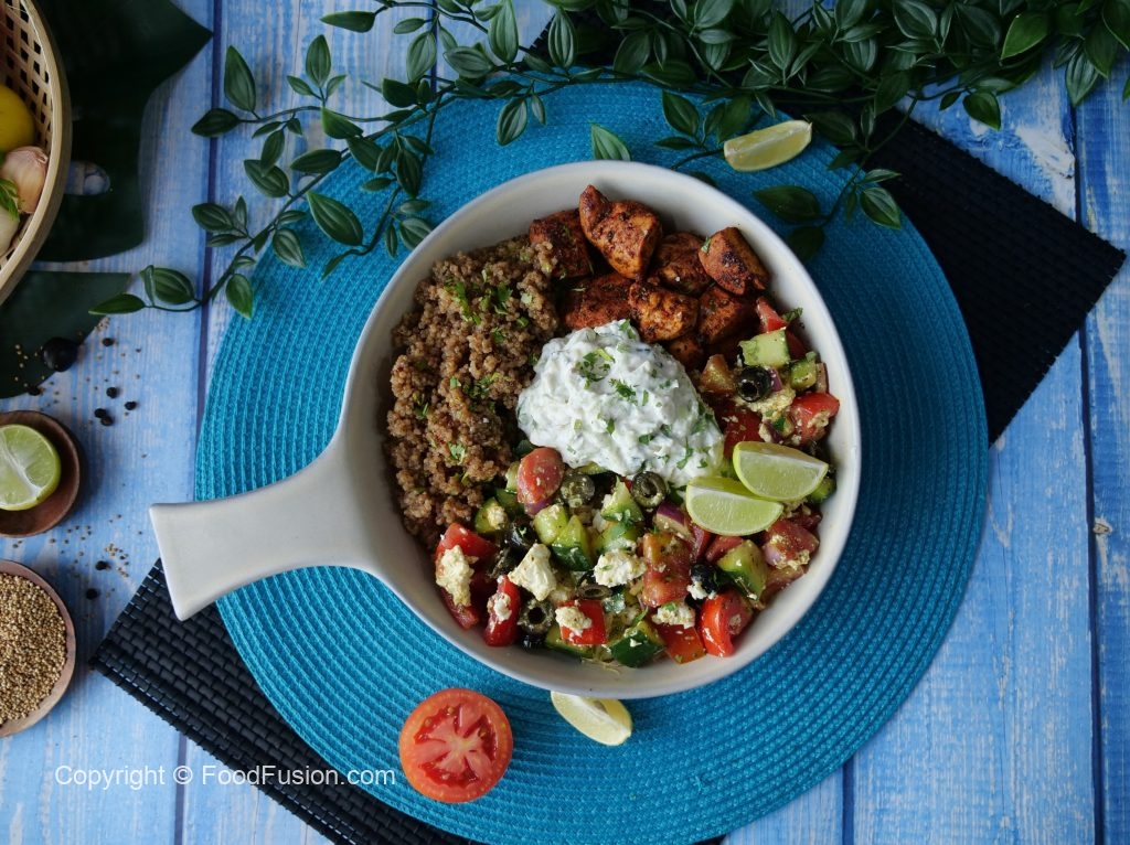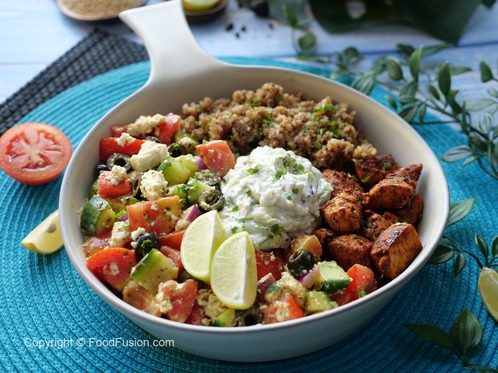 On a serving dish,add quinoa,greek salad,prepared chicken & tzatziki sauce.