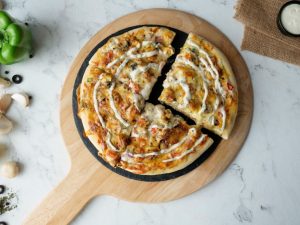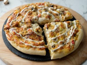 Add & spread ranch sauce 3-4 tbs,cheddar cheese,mozzarella cheese,cooked chicken,capsicum,onion, tomatoes,mushrooms,black olives,cheddar cheese,mozzarella cheese,dried oregano & red chilli crushed (makes 3 medium Pizzas).