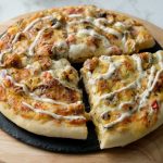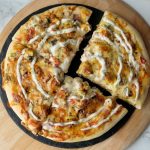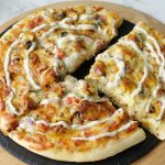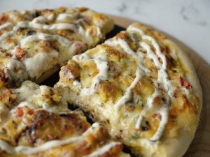 Take out from pizza pan & drizzle prepared ranch sauce then cut into slices & serve!