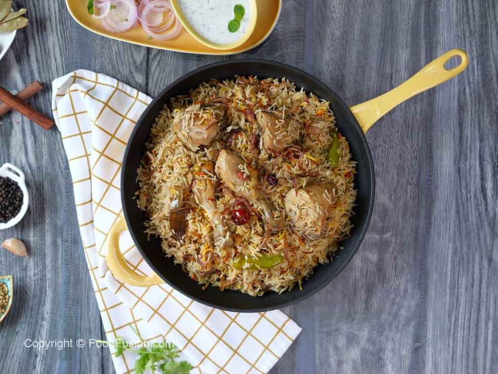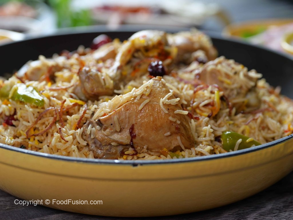 -Green chillies, orange food color, fried onion, lemon slices, fresh coriander, mint leaves dalain, phir kitchen cloth aur lid se cover kar ke dum par 10-12 minutes paka lein.