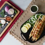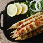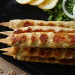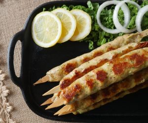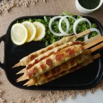 Dip hands in water & take a mixture (55g) and make kababs of equal sizes on wooden skewer (makes 14-15).
